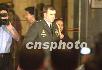 美國駐華使館國防武官席樂高準將十日晚七時許走出?谖娜A大酒店,乘中方車輛前去與美機組人員見面。中新社記者 賈國榮 攝