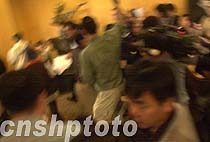 云集?诘囊话俣嗝型庥浾,十一日晚七時(shí)許采訪海南省政府外事辦公室在?谖娜A大酒店舉行的新聞發(fā)布會(huì)后,立刻爆發(fā)新聞大戰(zhàn),眾記者奮力爭(zhēng)奪中國(guó)外長(zhǎng)唐家璇接受美國(guó)政府致歉信的文稿,然后各自飛奔去發(fā)稿。中新社記者 賈國(guó)榮 攝