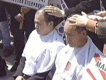 近日,日本文部省通過美化侵略的歷史教科書以來,韓國各界反應(yīng)強(qiáng)烈。全國各地不斷有游行、焚燒日貨的抗議活動(dòng)。圖為漢城民眾當(dāng)眾剃成光頭以示抗議。韓國民眾把頭發(fā)看作先人所賜,只有非常憤怒、失望時(shí)才會(huì)剃光頭。