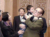 中國國家主席、中央軍委主席江澤民二十日在北京人民大會堂會見被美機(jī)撞毀戰(zhàn)機(jī)而犧牲的飛行員王偉的家屬時,抱起王偉的兒子相互親吻。