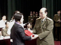 中央軍委二十四日在北京隆重舉行授予王偉“?招l(wèi)士”榮譽(yù)稱號命名大會,張萬年向王偉烈士的妻子阮國琴頒發(fā)授予王偉的一級英模獎?wù)潞蜆s譽(yù)證書。
