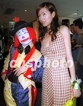 影視紅星楊恭如25日出席頒贈「美之標(biāo)本」體態(tài)大獎,與會場內(nèi)表演魔術(shù)的小丑合照。中新社圖 鄧慶樂 攝