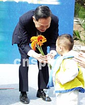 著名物理學(xué)家楊振寧先生,二十六日在北京清華大學(xué)理學(xué)院作《美與物理學(xué)》的報告前,接受一位北京小朋友獻出的鮮花。中新社記者 張勤 攝