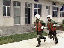 中國飛行員王偉烈士(右外側(cè)),生前在部隊聞信與戰(zhàn)友緊急出發(fā)。(資料圖片)