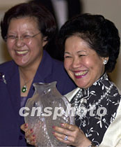 香港立法會5月3日晚為剛剛辭去政務(wù)司司長的陳方安生舉行“惜別晚宴”,立法會主席范徐麗泰代表立法會向?qū)佟半p魚星座”的陳方安生贈送“水晶雙魚”。中新社傳真 任晨鳴 攝