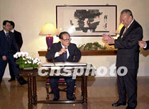 國(guó)家主席江澤民五月九日出席香港特區(qū)行政長(zhǎng)官董建華舉辦的午宴上在留言簿上簽名。中新社傳真 任海霞 攝
