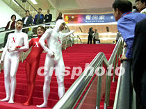 男女模特十日在北京國際展覽中心為觀眾指路,歡迎參觀剛開幕的國際科技博覽會。中新社記者 賈國榮 攝