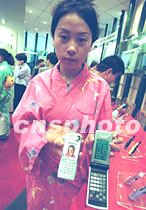 參加北京五月國際科技博覽會的日本公司,請公關(guān)小姐身穿和服展示新款可視手機和掌上電腦。中新社記者 賈國榮 攝