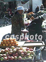 西藏拉薩五月的街頭,小販在叫賣著新鮮的水果。如今藏族人的生活水平日漸提高,購(gòu)買空運(yùn)的時(shí)鮮蔬果已經(jīng)不再是困難的事情。中新社記者 滿會(huì)喬 攝