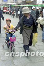 西藏拉薩的一位藏族小朋友騎著小自行車上街,與母親傳統(tǒng)的藏裝相比,他的裝備無(wú)疑是現(xiàn)代了許多。中新社記者 滿會(huì)喬 攝