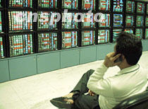 臺灣股市21日跌破五千點關口,股民忙著用手機致電經紀落盤買賣.中新社臺北傳真 王順 攝