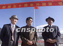 多彩西藏:布達(dá)拉宮前看升旗(圖文) 2001年5月24日 06:48 ![]() 中國西藏拉薩布達(dá)拉宮廣場二十三日舉行隆重的升旗儀式,慶祝西藏和平解放五十周年。中新社記者 滿會喬 攝 ![]() 全國人大常委會副委員長、西藏自治區(qū)政協(xié)主席帕巴拉·格列朗杰(中),自治區(qū)黨委常務(wù)副書記、自治區(qū)人大主任熱地(右)等出席了在拉薩布達(dá)拉宮廣場舉行的“升國旗·唱國歌”儀式。中新社記者 滿會喬 攝