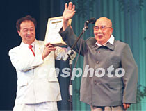 86歲高齡的京劇表演藝術(shù)家袁世海日前在北京人民劇場(chǎng)登臺(tái)演出京劇《紅燈記》,創(chuàng)下登臺(tái)演出年齡最大的吉尼斯紀(jì)錄。圖為有關(guān)人員向袁先生頒發(fā)吉尼斯紀(jì)錄證書(shū)。中新社圖 史利 攝