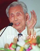 中國當代著名畫家吳冠中一日在清華大學舉辦的“藝術(shù)與科學”國際學術(shù)研討會上,就“藝術(shù)與科學之間的關(guān)系”等問題接受新聞媒體采訪。中新社記者 張勤 攝