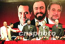圖:三大男高音演唱會新聞發(fā)布會 2001年06月21日 18:46 ![]() 世界三大男高音北京紫禁城演唱會新聞發(fā)布會21日在北京舉行,先期到達(dá)北京的帕瓦羅蒂、卡雷拉斯和三大男高音的經(jīng)濟(jì)人魯?shù)浪沟瘸鱿⒒卮鹆酥型庥浾叩奶釂。中新社記?李剛 攝