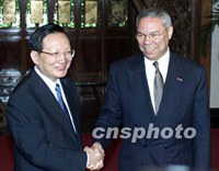 組圖:中國外長唐家璇與美國國務(wù)卿鮑威爾會談 2001年07月28日 10:13 ![]() 中國外交部長唐家璇二十八日在北京釣魚臺國賓館會見美國國務(wù)卿鮑威爾。中新社記者 滿會喬 攝 ![]() 中國外交部長唐家璇與美國國務(wù)卿鮑威爾二十八日在北京釣魚臺國賓館舉行會談。中新社記者 毛建軍 攝