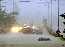 桃芝臺(tái)風(fēng)造成臺(tái)灣46人死亡 當(dāng)局解除陸上警報(bào) 2001年07月31日 10:08 ![]() 當(dāng)局出動(dòng)直升機(jī)救援被困民眾 ![]() 暴雨造成公路淹水,許多汽車在水中動(dòng)彈不得。 中新網(wǎng)香港7月31日消息:桃芝臺(tái)風(fēng)重創(chuàng)臺(tái)灣,截至臺(tái)灣有關(guān)當(dāng)局今天上午8時(shí)30分統(tǒng)計(jì),已經(jīng)造成46人死亡、150人失蹤、32人受傷。目前已知至少花蓮還有37人失蹤、南投縣有87人失蹤、臺(tái)中縣有13人失蹤。由于失蹤多屬落水或被土石流淹沒(méi),預(yù)估罹難人數(shù)可能還會(huì)大幅暴增。 另一方面,隨著桃芝臺(tái)風(fēng)移向大陸,臺(tái)灣氣象局今天上午5時(shí)25分解除陸地臺(tái)風(fēng)警報(bào),海上警報(bào)不排除在中午以前解除。不過(guò),今天臺(tái)灣西半部及東北部仍有機(jī)會(huì)出現(xiàn)豪雨,氣象局提醒民眾仍要多注意。 桃芝臺(tái)風(fēng)雖然已經(jīng)逐漸遠(yuǎn)離,但是強(qiáng)勁雨勢(shì),造成各地紛紛傳出災(zāi)情,使得后續(xù)善后的工作無(wú)法完成,受創(chuàng)嚴(yán)重的南投縣政府及臺(tái)中縣和平鄉(xiāng),已經(jīng)做出31日停止上班上課的決定。 至于宣布照常上班上課的縣市則有:臺(tái)北縣、臺(tái)北市、臺(tái)中市、連江縣;彰化縣是正常上班、但是國(guó)中小停課,高中以上正常上課。 電信方面,至30日22時(shí)止,共有16790戶電話故障。用水部分,花蓮、臺(tái)東、嘉義、南投、苗栗、臺(tái)中縣市、高雄縣等地區(qū),因豪雨致凈水場(chǎng)取水口遭土石淹沒(méi),目前仍有478310戶停水。電力方面,全臺(tái)共有347581戶停電。 農(nóng)牧損失12.45億元,當(dāng)局將要求農(nóng)產(chǎn)公司等單位緊急釋出7千公噸蔬菜,避免菜價(jià)狂飆。 東森新聞援引臺(tái)灣的消防署統(tǒng)計(jì)資料,近15年來(lái)造成嚴(yán)重災(zāi)情的臺(tái)風(fēng)分別是2000年象神臺(tái)風(fēng)(64人死亡、25人失蹤、65人受傷);1996年賀伯臺(tái)風(fēng)(51人死亡、22人死亡、463人受傷);1997年溫妮臺(tái)風(fēng)(44人死亡、1人失蹤、84人受傷);1998年瑞伯臺(tái)風(fēng)(28人死亡、10人失蹤、27人受傷)。 |