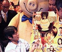 香港明星周星馳3日出席其主演的電影《少林足球》推出電腦游戲的記者會(huì),宣傳即將開發(fā)的電腦游戲軟件。中新社圖 尤圣斌 攝