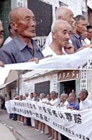 中國江蘇省崇山村村民,十五日在村委會前集會,抗議日本首相小泉參拜供奉著二戰(zhàn)甲級戰(zhàn)犯的靖國神社。日本侵華期間,有上百名崇山村民,無辜慘死在日本于此地進行的細菌戰(zhàn)之中。