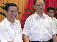 八月十五日上午,中共海南省委召開干部大會。中共中央組織部副部長黃晴宜宣布:杜青林不再擔(dān)任海南省委書記職務(wù),另有任用;任命白克明接任中共海南省委書記職務(wù)。在海南工作了九年多的杜青林與剛剛履新的白克明握手“交班”。中新社記者 關(guān)向東 攝