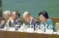 ![]() 聯(lián)合國環(huán)境規(guī)劃署官員巴克利·肯特四日在北京出席“21世紀論壇-綠色與環(huán)保2001年會議”,并作演講。中新社記者 滿會喬 攝 ![]() “21世紀論壇-綠色與環(huán)保2001年會議”四日在北京開幕,全國政協(xié)副主席葉選平(左一)、宋。ㄗ蠖⒅袊謽I(yè)科學研究院院長江澤慧(右一)等出席開幕式。中新社記者 滿會喬 攝