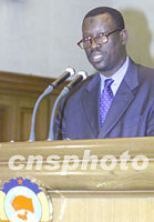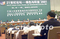 ![]() 聯(lián)合國(guó)環(huán)境規(guī)劃署官員巴克利·肯特四日在北京出席“21世紀(jì)論壇-綠色與環(huán)保2001年會(huì)議”,并作演講。中新社記者 滿會(huì)喬 攝 ![]() “21世紀(jì)論壇-綠色與環(huán)保2001年會(huì)議”四日在北京開幕,全國(guó)政協(xié)副主席葉選平(左一)、宋。ㄗ蠖⒅袊(guó)林業(yè)科學(xué)研究院院長(zhǎng)江澤慧(右一)等出席開幕式。中新社記者 滿會(huì)喬 攝