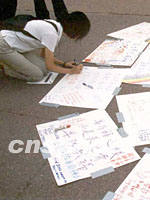 圖:紐約華人以各種形式譴責(zé)恐怖主義 2001年09月19日 15:01 ![]() 紐約華埠孔子廣場(chǎng)平整的紅色地面上,近日貼著許多白色卡紙,上面用中英文寫(xiě)著譴責(zé)恐怖活動(dòng);悼念“九一一”死難者;祈求世界和平;以及支持重建世貿(mào)中心大廈的字句和詩(shī)篇。圖為一位華裔女青年跪在地上寫(xiě)下自己的心愿。中新社圖 龔文謨 攝 |