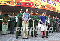 組圖:北京西城警方開展“嚴打”專項行動 2001年09月20日 15:06 ![]() 袁存敏等七名盜竊、搶劫犯罪嫌疑人,二十日在北京萬通商場前,被西城公安局公開逮捕。警方在人員密集地段進行公開宣判,以威懾犯罪分子、增強市民防范意識。中新社記者 宋吉河 攝 ![]() 北京公安西城分局二十日公開逮捕七名犯罪嫌疑人,并對三名違法人員依法勞動教養(yǎng)。該局在“嚴打”行動中破獲各類刑事案件1531起、抓獲各類犯罪嫌疑人2058名、收容“三無”人員15110人次。中新社記者 宋吉河 攝