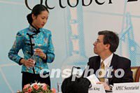 圖文:APEC官員呼吁加快貿(mào)易和投資自由化 2001年10月17日 17:56 ![]() APEC貿(mào)易投資委員會(huì)執(zhí)行主席GERMAN KING(左),十七日在上海國(guó)際新聞中心召開新聞發(fā)布會(huì),他在回答中外記者提問時(shí)說,貿(mào)易和投資自由化的推動(dòng)將有利于減弱恐怖活動(dòng)對(duì)世界經(jīng)濟(jì)的不良影響。中新社記者 王瑤 攝 ![]() 身著旗袍的上海小姐為APEC會(huì)議服務(wù),在十七日召開的新聞發(fā)布會(huì)上,APEC貿(mào)易投資委員會(huì)執(zhí)行主席GERMAN KING向服務(wù)小姐點(diǎn)頭致謝。中新社記者 王瑤 攝