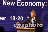 圖:美國總統(tǒng)布什在APEC的CEO峰會(huì)演講 2001年10月20日 16:09 ![]() 美國總統(tǒng)布什二十日在上海香格里拉飯店舉行的亞太經(jīng)合組織工商領(lǐng)導(dǎo)人峰會(huì)上發(fā)表演講。中新社記者 毛建軍 攝 |
