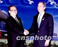 圖:江澤民迎接美國總統(tǒng) 2001年10月21日 11:33 ![]() 10月20日,中國國家主席江澤民在上海國際會議中心迎接美國總統(tǒng)布什。中新社圖 |