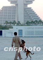 ![]() 九日,一名卡塔爾警察在警犬的幫助下對(duì)喜來(lái)登酒店附近進(jìn)行安全檢查。中新社記者 錢興強(qiáng) 攝
