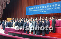 圖:中國加入WTO簽字儀式現(xiàn)場(chǎng) 2001年11月12日 02:43 ![]() 中國加入WTO簽字儀式于北京時(shí)間12日凌晨在多哈舉行,圖為簽字現(xiàn)場(chǎng)。中新社記者 錢興強(qiáng) 攝 |
