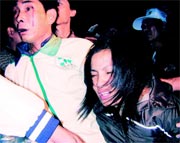 圖文:臺灣民進黨造勢會發(fā)生內(nèi)訌 數(shù)百人互毆 2001年11月27日 09:04 ![]() 黃正男女兒黃露慧被打傷,其后男子眼角出血。(臺灣聯(lián)合報圖) 中新網(wǎng)香港11月27日消息:臺北訊,臺灣民進黨昨晚在嘉義舉行的一場選前造勢會,發(fā)生民進黨嚴重內(nèi)訌事件,數(shù)百人先后兩度發(fā)生沖突,互相毆打造成多人受傷。 由于民進黨“立委”候選人蔡同榮在昨天的晚會上邀請陳水扁站臺造勢,同黨籍嘉義“市長”候選人黃正男的支持者認為未獲通知,有不被尊重的感覺,遂在造勢場合上,一路追打蔡同榮。蔡同榮的小腿因此受輕傷。 這場沖突前后發(fā)生兩次,第一次在晚間8時陳水扁進場時,黃正男的支持者為了一問究竟,當場追打蔡同榮。第二次在陳水扁離去時,場內(nèi)再次打起來。 在喊打聲中,一陣拳打腳踢,黃正男的女兒黃露慧也被打傷。 現(xiàn)場消息指,參與互毆者達三四百人之眾。 陳水扁致辭時,黃正男的支持者在臺下特別以汽笛制造聲響抗議,陳水扁在臺上強調(diào)這場造勢晚會是為蔡同榮造勢,請大家保持“理性及風度”。 陳水扁在臺上說話間,黃正男不顧安全人員引導(dǎo),強行走上演講臺左邊,遭安全人員擋在講臺樓梯旁。陳水扁在臺上大聲疾呼,黃正男表情頗為無奈,只好自行走下講臺并繞到講臺前面,但終被安全人員引導(dǎo)離開。 陳水扁在晚上8時45分結(jié)束演講,由安全人員護衛(wèi)搭車離開,部分在場民眾見狀,又朝車隊方向追逐,這時有人阻擋、有人吶喊,場面相當混亂。 據(jù)指出,這場沖突的由來并不突然,嘉義“市長”選舉幾場造勢場合所引發(fā)的驚爆點,黃正男擁有民進黨提名的身分,但在幾次造勢場合中,泛綠陣營支持無黨籍“市長”候選人陳麗貞的傳言甚囂塵上,黃正男則被指為陳水扁“棄!钡膶ο,終于引發(fā)黃正男的支持者不滿。 尤其在24日晚,陳水扁的老師、臺大教授李鴻禧在嘉義為陳麗貞站臺。當時李鴻禧強調(diào),民進黨推出的“市長”候選人根本“毫無勝算”,他自稱身為阿扁的老師,當然知道陳水扁支持的是陳麗貞。 |