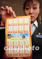 圖:國家郵政局11日發(fā)行中國入世紀(jì)念郵票 2001年12月10日 17:21 ![]() 國家郵政局將于十一日發(fā)行中國入世紀(jì)念郵票一枚,面值0.8元人民幣。中新社記者 史利 攝 |