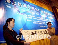 圖:廣州是“海上絲綢之路”的最早始發(fā)港 2002年01月12日 19:13 ![]() “海上絲綢之路與廣州港學(xué)術(shù)研討會”十二日在廣州舉行,據(jù)專家、學(xué)者論證,魏晉時(shí)期從廣州啟航到東南亞各國的航道就已開通,廣州是海上絲綢之路的始發(fā)大港。圖為香港知名學(xué)者饒宗頤向研討會送上“聲教訖于四!钡臋M幅。中新社圖 羅仰明 攝 |