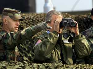 布什視察都羅山車站 稱南北鐵路是和平之路(圖) 2002年02月20日 14:41 ![]() 布什在非軍事區(qū)用望遠(yuǎn)鏡觀望朝鮮一側(cè)(美聯(lián)社) 中新網(wǎng)北京2月20日消息:韓國總統(tǒng)金大中和來訪的美國總統(tǒng)布什今天視察都羅山車站。這個車站是金大中希望連接平壤和漢城的鐵路線的北終點站。 據(jù)韓國聯(lián)合新聞社報道,金大中希望借此舉來敦促朝鮮對恢復(fù)對話的呼吁作出回應(yīng)。 在上午的首腦會談中,兩國總統(tǒng)就聽取了這項連接南北的鐵路工程的進(jìn)度情況簡報。 在舉行聯(lián)合記者招待會后,布什乘直升飛機(jī)花費二十分鐘抵達(dá)非軍事區(qū)。這個二點五英里寬,一百五十一英里長的區(qū)域布滿地雷,分界線兩側(cè)駐扎著將近朝韓兩百萬軍隊。 美國在韓國保持有三萬七千人的駐軍。布什在抵達(dá)時向一名指揮官威廉·米勒中校敬禮致意。 布什在都羅山車站發(fā)表講話。他說:“我們今天相聚在這里,周圍是朝鮮半島和平與穩(wěn)定受到挑戰(zhàn)時的遺跡。金大中總統(tǒng)剛才向我介紹了一條他修建的道路--一條和平之路! 據(jù)路透社報道,布什敦促朝鮮對韓國開放邊境。他說:“這條鐵路可能將這塊分裂的土地兩側(cè)的人民帶到一起來。為了朝鮮半島全體人民的福祉,朝鮮應(yīng)該完成它! 布什在非軍事區(qū)的講話強(qiáng)硬的措詞中也顯示出靈活性。他甚至在談及朝鮮時仍使用了“邪惡”這個字眼,但他同時也重申了朝鮮對話的建議。 在一個觀察哨所里,布什身穿一件手臂上繡有美國國旗的綠色軍用夾克,通過雙筒望遠(yuǎn)鏡從壘著沙袋的地堡內(nèi)觀察朝鮮一側(cè)。
