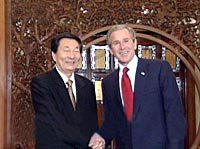 朱镕基會(huì)見布什 強(qiáng)調(diào)中美關(guān)系搞好對世界有利 2002年02月22日 11:37 ![]() 中國國務(wù)院總理朱镕基二十二日在北京釣魚臺(tái)國賓館會(huì)見來訪的美國總統(tǒng)布什。