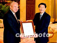 朱镕基會見董建華 中央全力支持香港恢復經濟 2002年03月07日 15:11 ![]() 中國總理朱镕基七日上午在北京人民大會堂香港廳,向連任香港特別行政區(qū)第二任行政長官的董建華先生頒發(fā)任命書。中新社記者 賈國榮 攝