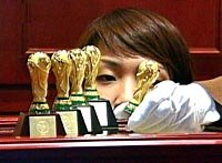 圖:韓國商人在世界杯前推出仿制大力神杯收藏品 2002年04月09日 14:59 ![]() 世界杯在即,韓國商人推出仿制大力神杯收藏藝術(shù)品。