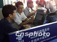圖:聯(lián)通為博鰲論壇提供免費(fèi)上網(wǎng)卡服務(wù) 2002年04月09日 19:16 ![]() 中國聯(lián)通的工作人員四月九日在海南博鰲為采訪論壇的中外記者安裝無線上網(wǎng)卡,會議期間中國聯(lián)通將為記者提供免費(fèi)的無線高速上網(wǎng)服務(wù)。中新社記者 滿會喬 攝