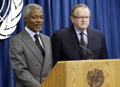 聯(lián)合國秘書長安南任命杰寧難民營真相調查團(圖) 2002年04月23日 09:47 聯(lián)合國秘書長安南與芬蘭前總統(tǒng)阿赫蒂薩里在新聞發(fā)布會上。(法新圖) 中新網北京4月23日消息:聯(lián)合國秘書長安南星期一說,芬蘭前總統(tǒng)阿赫蒂薩里將率領調查團,前往西岸巴勒斯坦城市杰寧的難民營。 據(jù)德新社報道,安南表示這是根據(jù)聯(lián)合國安理會的決議作出的決定。安理會上周對美國的提議進行表決,決定向杰寧難民營派出調查團,調查有關以色列制造屠殺的指控。 聯(lián)合國前難民事務專員日本人緒方貞子和國際紅十字會前主席瑞士人索馬魯加都將參加這個調查團,退役的美國將軍威廉·納什和曾經領導過駐波斯尼亞聯(lián)合國警察部隊的愛爾蘭人菲茨杰拉德將擔任調查小組的軍事顧問。 安南表示:“這個小組的成員都是經驗豐富,具有較高水準的專業(yè)人士。我需要有一個具有獨立意志的調查小組!