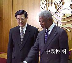 圖:胡錦濤與聯(lián)合國(guó)秘書長(zhǎng)安南會(huì)晤 2002年04月30日 08:42 ![]() 美國(guó)東部時(shí)間四月二十九日下午,中國(guó)國(guó)家副主席胡錦濤一行在首次對(duì)美國(guó)進(jìn)行正式訪問(wèn)期間,來(lái)到紐約聯(lián)合國(guó)總部,與聯(lián)合國(guó)秘書長(zhǎng)安南會(huì)晤。中新社記者 陳建 攝