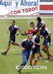 哥斯達黎加隊在日本鈴鹿市進行首次訓(xùn)練(圖) 2002年05月15日 14:42 ![]() 哥斯達黎加國腳們進入集訓(xùn)地后立刻開始訓(xùn)練(14日上午攝于三重縣鈴鹿市的運動場=共同社) 中新網(wǎng)北京5月15日消息:世界杯參賽國——哥斯達黎加國家隊14日在三重縣鈴鹿市的運動場內(nèi)進行了首次訓(xùn)練,開始了備戰(zhàn)世界杯正式比賽的調(diào)整訓(xùn)練。 據(jù)“共同社”報道,哥斯達黎加隊作為首支到達日本的世界杯參賽國于13日晚上到達鈴鹿市。在主教練吉馬雷斯的指揮下,23名球員在用球訓(xùn)練中進行了小比賽等,大聲呼喊汗流浹背。右膝傷病令人擔心的主力前鋒萬喬普也展示了輕快的動作。 吉馬雷斯主教練表示“訓(xùn)練環(huán)境非常好。我們的目標是在世界杯中盡可能走得遠一點?傊椭袊犨M行的首場比賽非常重要!备缢惯_黎加隊將在鈴鹿市集訓(xùn)到23日。