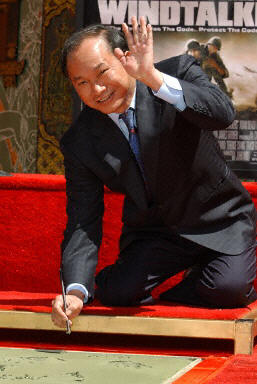 圖:中國(guó)香港著名導(dǎo)演吳宇森留印好萊塢 2002年05月22日 12:53 5月21日,中國(guó)香港著名導(dǎo)演吳宇森在美國(guó)影城好萊塢的“中國(guó)戲院”前的水泥地板上印上了自己的手印和足印。法新供中新