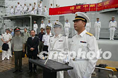 圖:中國(guó)海軍環(huán)球航行訪問艦艇編隊(duì)在新加坡 2002年05月23日 19:05 ![]() 中國(guó)海軍首次環(huán)球航行訪問艦艇編隊(duì)指揮員丁一平少將,二十三日上午在新加坡海軍基地樟宜港致答辭,感謝新加坡各界的熱烈歡迎。中新社圖 躍勝岐 攝