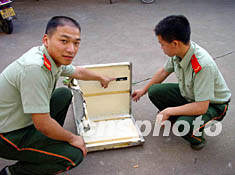 圖:一塊華航空難客機殘骸運抵泉州 2002年05月30日 10:37 ![]() 五月二十九日下午,“閩泉漁0一七九號”漁船將打撈出的一塊華航客機殘骸交予邊防派出所。這塊客機殘骸是一塊“T”字型的鋁合金邊的木板,木板邊沿上刻有“409A”、“409”兩處紅色標記,一塊木板右上側(cè)貼有一小塊黑色的鐵皮,上面印有“MAX.INSERT”和“WEIGHT 40.0 POUNDS”兩排英文字母。徐承彬 攝