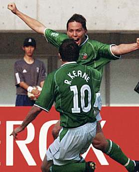 雙方各打半場好球 "雄獅"喀麥隆1-1平愛爾蘭(圖) 2002年06月01日 16:44 ![]() 愛爾蘭隊球員羅比-基恩與隊友為霍蘭德的進(jìn)球而歡呼。共同社圖 中新網(wǎng)東京6月1日消息:在剛剛在日本新瀉結(jié)束的世界杯外圍賽E組的首回合的第一場比賽中,“非洲雄獅”喀麥隆隊在領(lǐng)先一球的大好形勢下,被“綠衣男孩”愛爾蘭隊將比分追平,雙方以1-1結(jié)束了比賽。 由于隊長羅伊·基恩在世界杯前因為和教練不和而退出,愛爾蘭隊的實力大打折扣。為此,愛爾蘭不得不以22人參加世界杯的比賽。而喀麥隆隊陣容完整,賽前顯得信心十足,表示要學(xué)習(xí)塞內(nèi)加爾好榜樣,全取3分。 上半場喀麥隆隊表現(xiàn)出色,他們利用嫻熟的個人技術(shù),不但向愛爾蘭隊的腹地發(fā)動沖擊。在鋒線上,在比賽中,姆博馬和埃托奧配合默契,給對手以很大的壓力。相對而言,愛爾蘭則遲遲沒有找到感覺,在比賽中顯得節(jié)奏有些跟不上,顯得很被動。比賽僵局在第39分鐘打破,埃托奧在右路利用出色的個人技術(shù)撕開對手的防線,并且將門將吸引出來,隨后他將球傳給門前的姆博馬,后者一蹴而就,率先破門得手。 此后,一球在手的喀麥隆隊開始有些放松,最終在上半場以1-0結(jié)束該場比賽。在下半場,愛爾蘭隊開始顯示出他們預(yù)選賽淘汰荷蘭隊的比賽中的素質(zhì),開始控制了比賽節(jié)奏。 下半場開始7分鐘后,愛爾蘭人的努力得到回報,由于喀麥隆隊后衛(wèi)解圍時出現(xiàn)低級失誤,將球送到中路愛爾蘭隊霍蘭德的腳下,后者迎球怒射,幸運的將球送入對方大門。 此后,愛爾蘭圍著喀麥隆隊的大門狂轟濫炸,其中一次射門擊中門柱,但是只開花不結(jié)果,最終雙方以1-1握手言和。 愛爾蘭(442):吉文;凱利,哈特(77分鐘,雷德),斯湯頓,布林;麥卡蒂爾(46分鐘,菲南),霍蘭德,基爾巴尼,金塞拉;達(dá)夫、羅比-基恩 喀麥隆(3-5-2):門將:阿利烏姆;沃姆,宋,卡拉;查托,格雷米,勞倫,福,奧萊姆貝;埃托奧、姆博馬(69分鐘,蘇佛)