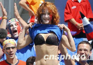 圖:法國瘋狂女球迷看臺上掀起上衣 2002年06月11日 14:38 ![]() 6月11日下午,韓日世界杯A組丹麥隊與法國隊的比賽在韓國仁川文鶴體育場進行,圖為法國瘋狂女球迷看臺上掀起上衣。