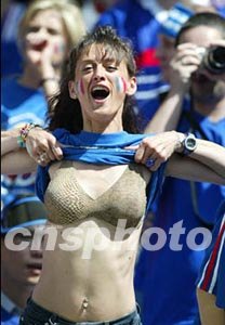 圖:狂熱的法國女球迷 2002年06月11日 20:27 ![]() 世界杯足球賽A組法國對丹麥的比賽十一日在韓國仁川舉行,圖為狂熱的法國女球迷。毛建軍 攝